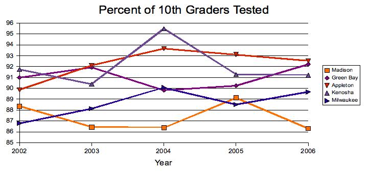 It is hard to tell if there is any pattern in the data, though it does look like we, as a District, are gradually getting better at getting our low income students tested at similiar rates as our non-economically disadvantaged students. However, when you look at overall percentages of students tested, it does not seem that Madison is doing a very good job of testing students. This is what DPI says about student participation: All students are expected to take WSAS assessments except students who are excused by their parents. Only a fraction of a percentage of students statewide are excused from WKCE testing by their parents. An extended testing window is provided so that students who are absent on any given day can take make-up tests. Some students are not assessed possibly due to long-term absences or other reasons. While this suggests that MMSD is not meeting the expectations of DPI regarding student assessment, it is reasonable to ask how other similar districts around the state are doing in their testing of 10th grade students. For this comparison, I examined enrollment data and number of students tested for Green Bay, Appleton, Kenosha, and Milwaukee school districts. All of these numbers come from DPI and reflect students in all high schools and alternative programs. As an aside, I will note that the third Friday enrollment numbers listed by MMSD do not match those posted on the DPI website, and it is for the sake of an honest comparison that I have used DPI numbers for all five districts.