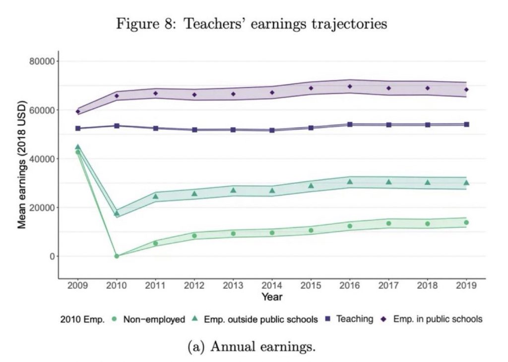 But third, and most importantly, the EPI data don’t tell us what happens to actual teachers when they enter and exit the profession. If they are correct, and teachers are earning far less than they should, then teachers should see a huge pay increase when they leave the profession.
