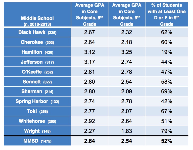“Inconsistency in grading and academic expectations between the middle schools may contribute to difficulty in transitioning to high school. The differences between the feeder middle schools are significant.”