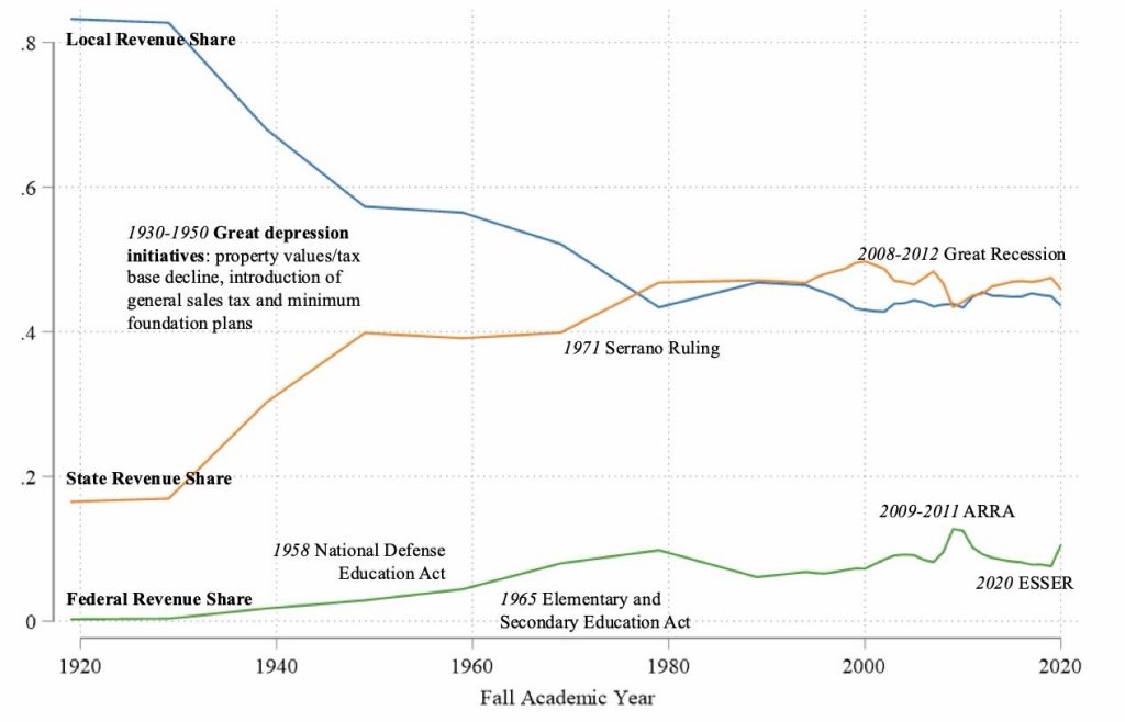 Section 2 documents the long-run shift from local property tax finance toward larger state and federal roles, driven by economic crises, legislation, and litigation. Section 3 describes the contemporary funding system, including the distinct roles of state, local, federal, and non-governmental revenues. Section 4 explains the core functions of state finance formulas, focusing on adequacy baselines, required local effort, and incentives for additional local spending. Section 5 reviews the school finance reform movement, showing how litigation moved from equal protection to equity and then to adequacy, with contemporary examples from Washington, California, and Tennessee. Section 6 evaluates school finance in terms of efficiency and equity, reviewing evidence that additional revenues improve achievement and long-run outcomes, generate broader social benefits, affect housing markets, and remain unevenly distributed across places and student groups.